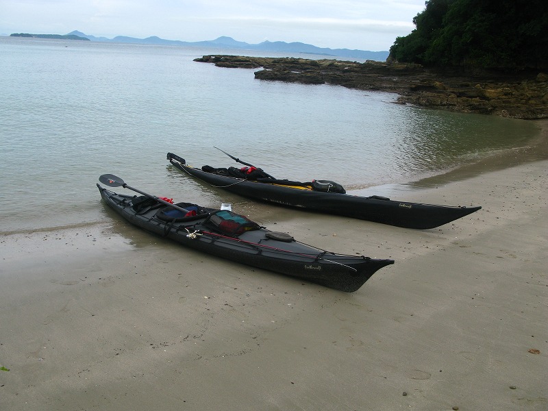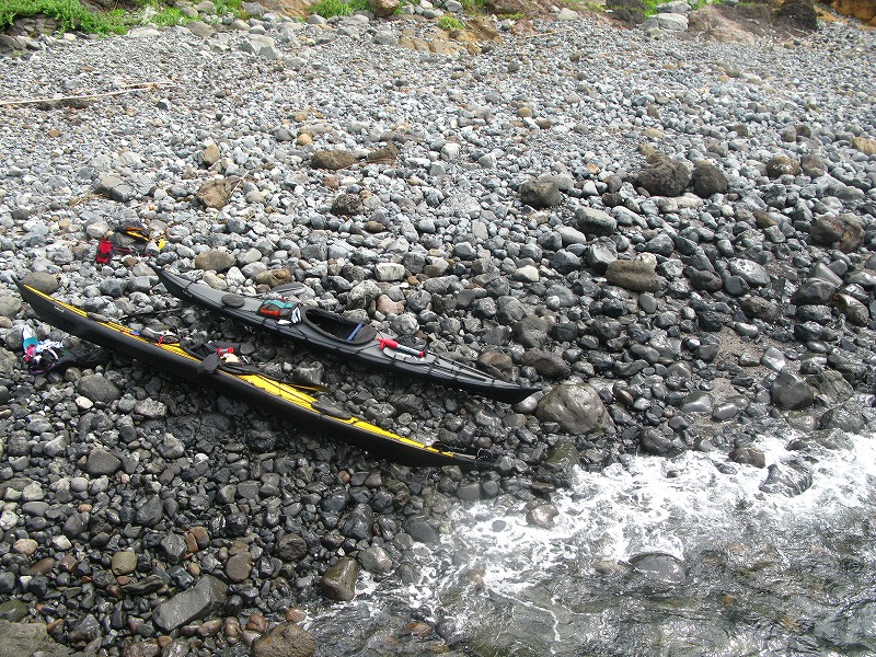 漁労活動のため島南端のゴロタの浜に上陸。こういう場合フォールディングカヤックは「壊れませんか?」と聞かれる事がありますが、リジットに較べしなりがあるのと丸い石の上は船体が滑るのでむしろ有利かもしれません。まあ、フォールディング、リジット問わずこういう着岸・離岸はシーカヤックの技術のなかでかなり重要な位置を占めると私は考えています。パドリングそのものは漕いでりゃ判る、みたいなところがあります。