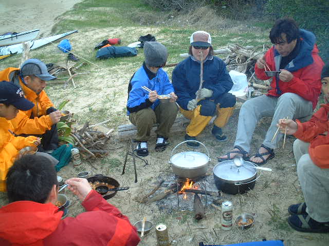穏やかな海を進み、目的の無人島に到着。まずは地カキを採りに行く。この季節が一番美味いのです。キャンプを設営した後、今夜のディナーの準備。初導入のアルミ製ダッヂオーブンを駆使してブイヤベース風鍋、ベーコンビーンズなどを作る。