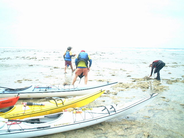 仕事っぽい事は軽~く済ませて早速カヤックに連れてっていただく。中部の恩納村あたり。この日は大潮でリーフが完全に露出してました。なにか獲物を探す一行。