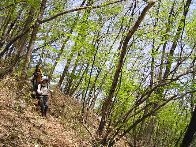 標高約1500メートルの稜線に続くフラットなトレイルにはブナの原生林が色濃く残る。人工の看板やベンチなどが少なく、かなりお気に入りのコース。その途中の無人小屋が本日の宿。シュラフ・食料・酒がずっしりくる。なかなかこの重さ背負わなくなったな~。