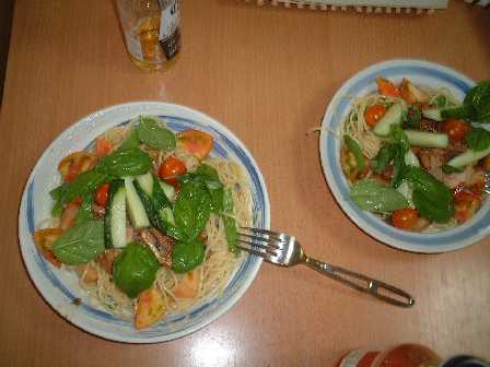 お昼のパスタ。麺を茹でたら速攻水で冷やします。トマト、キュウリ、ツナ缶(今回はサンマの缶詰も)を麺にのせ、生バジルを手でちぎってたっぷりまぶします。味付けオリーブオイル・バルサミコ酢・黒胡椒・チリソースをテキトーにかけて食べます。ちなみに我が家の庭にはマイがトマト・バジルその他栽培しているのでこうして食べると大変美味しいです。今度ツアーでも作りますね。