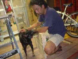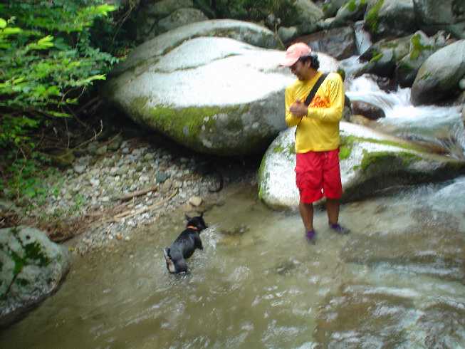 ソフトクーラーにビールを詰めてプチ沢登り。どうも海より沢がニガテなロッキー君も必死についてくる。