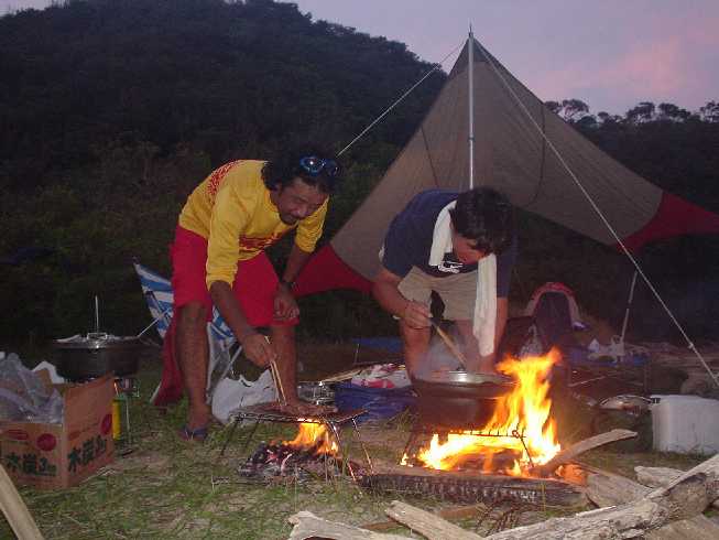 焚き火でサンマやラムを焼いたり、スープを作る。夜食には差し入れで「ラーメン屋さん」のラーメンも。