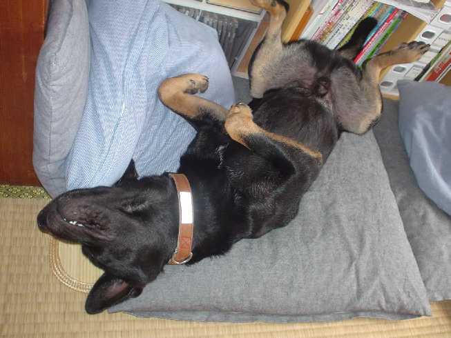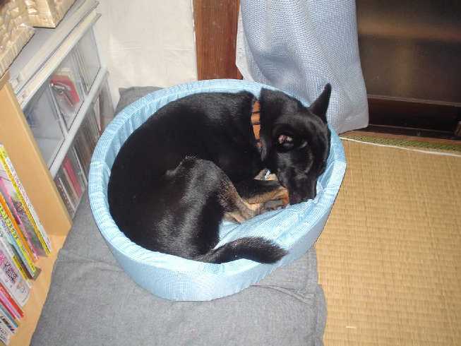 ロッキー君、買ってもらったベッド?で律儀に寝てます。少しおサイズがキツいみたいですけど・・・。