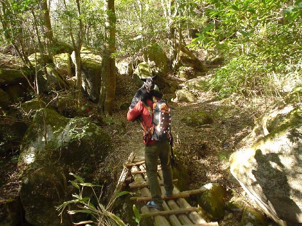 丸太で架けられた橋です。それまで威勢の良かったロッキーはビビリ屋なので渡れません。世話の焼けるヤツだ。
