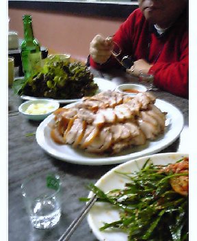 韓国流「豚足」かな?甘辛いチャーシューみたいなヤツです。チシャにニンニクなどと一緒に包んで食べます。それにしても凄い量。