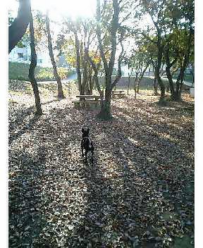 ロッキーと朝の散歩をする家の前の公園。一面枯葉の絨毯です。