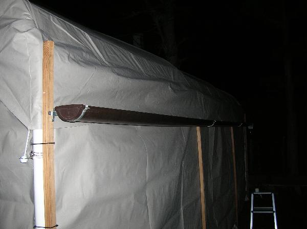 新設したテント式艇庫に雨どいを設置。勾配をつけるのが意外に難しい。水をテストで流しながら試行錯誤です。
