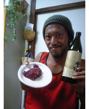 家に帰りつくと、同じく宮崎にサーフィン旅行に出掛けていたサトヤンが貸してたキャンプ道具を返しにきた。「木挽き」を買ってきてきてくれたので馬刺しを食べながら飲む。
