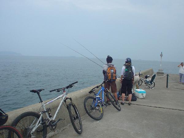 船待ちの間、港をブラブラ。アジが入れ食い状態&ボーゼンと見学の2人。