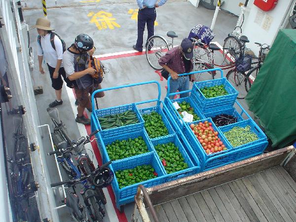 帰りのフェリーには能古産の野菜が積み込まれていました。美味そう。