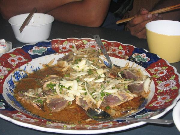 夜は酒井さん特製のカツオのタタキ。ちゃんと藁で炙り、ニンニクたっぷりのタレに漬かった絶品。これを食べると飲み屋のタタキは絶対食えなくなります。