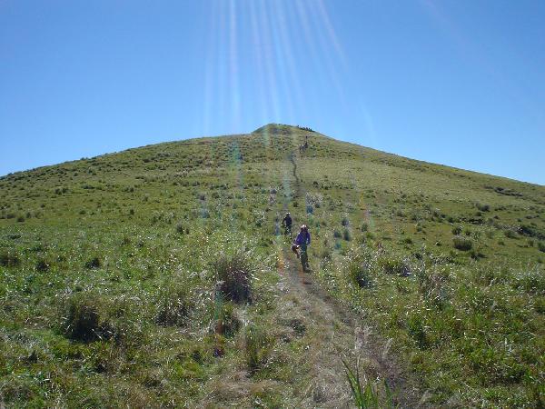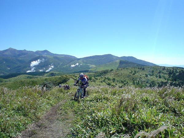 とりあえずはワシワシ登ります。遠くには阿蘇、祖母、雲仙まではっきり見えます。まさにMTBのベストシーズンです。それにしてもこのあたりは温泉だらけです。湯煙があちこちからモクモク上がるのを見つつの、いかにも九州チックな風景の中のライディングです。