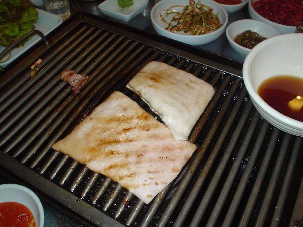 夜はMTB仲間と豚の焼肉屋へ。写真は豚の皮を焼いているところ。韓国でも最近になって一般的に食べるようになったらしいです。