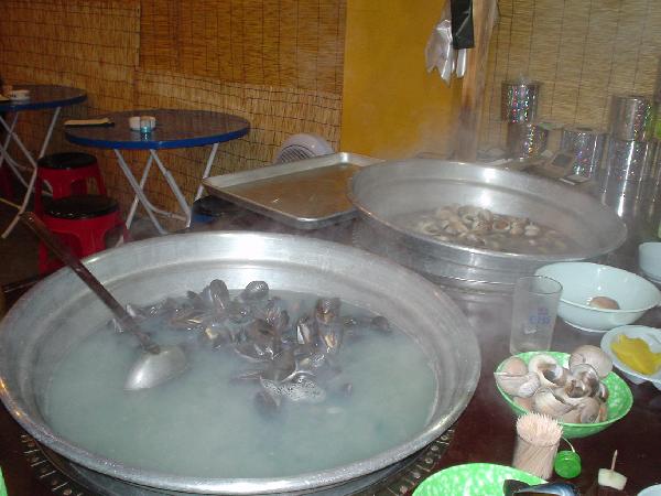 2軒目は「貝」のみの店。しかもこの写真の2種類のみ!奥の白い巻貝を頼むと、手前の黒い2枚貝はタダ!でついてきます、というシステム?