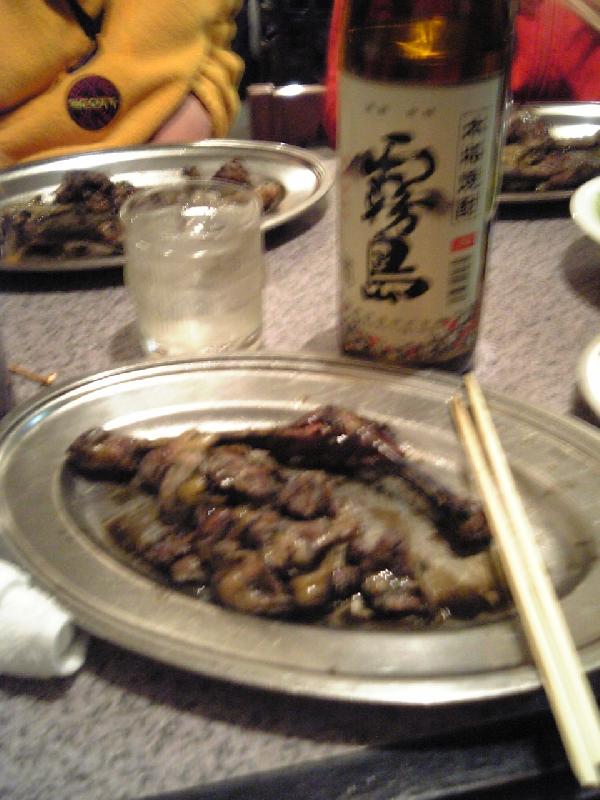 地元のライダーの皆さんに連れられていった店は大勢で予約無しで押しかけた為、店主半ギレ状態。一見大きな店ですが完全に彼のキャパをオーバーしてしまったようです・・・。ま、これも旅の醍醐味と皆バラけて僕らは「関所」という名の地鶏屋さんへ突入。大当たりでした。炭の香りただようモモ肉は硬すぎずほど良い歯ごたえで・・・。同行のI氏と霧島を速攻で空に。