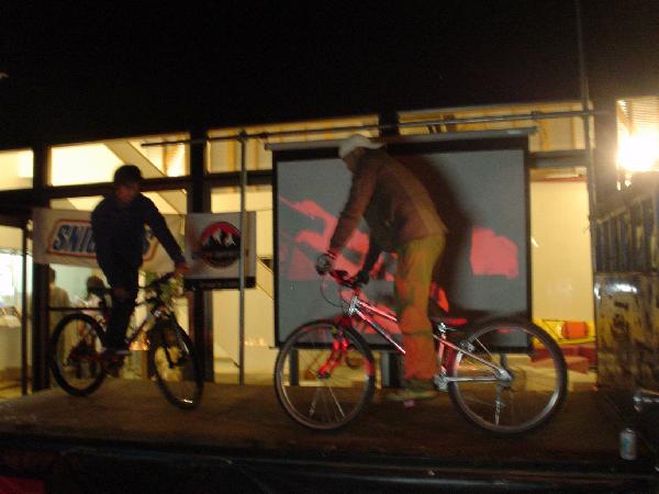 その後MTBのスタンディング大会・一本橋どこまで行けるか大会。決勝は去年に引き続きランドアースのボス、サコちゃんと僕の対決。2人と球磨焼酎でフラフラでした・・・。勝負は???