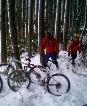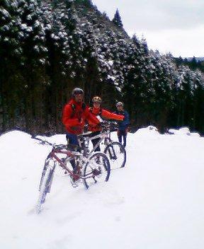 やはり雪のため大幅に遠回りして目的地に到着。激寒のなか着替えてスタート!といいつつアプローチの林道はほとんど乗れません・・・。