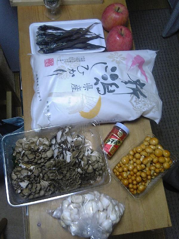 新潟でのお買い物。コシヒカリ・キノコ沢山・かんずり(東北版柚子胡椒?)・ゲンギョ(と言う名の変なサカナ。SARC久我氏より)などなど。北の地方はキノコ類が特に豊富だな~、と感じました。