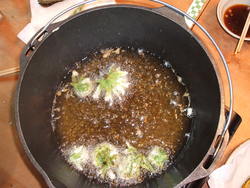 最近新たに下ろしたダッチオーブンで天ぷら。慣らしに最適です。ふきのとう、時期も終わりでイマイチかな~、と思ってましたがいやいやウマイ!もっと採っとけば良かった・・・。その他、鶏のセセリ(頸)の天ぷらも絶品。鉄鍋効果か、分厚いカボチャなんかもサクっと揚がります。ご参加のY氏、天ぷら部長に任命!コロモは冷やすべし・・・。