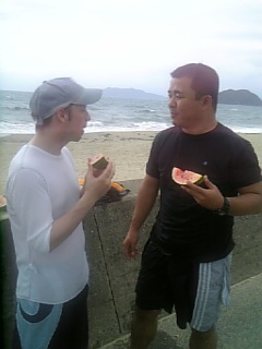 ここでも日本語の講習。「カンチョー!!!」に続き、「三年殺し」を英訳して伝えるF井さん。デビッドも理解が速い。