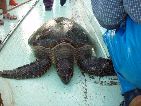 野間岬を廻りこんだ所にある定置網まで行き、網を巻き上げます。トビウオ、鯖、ダツ、シイラ、ハンマーヘッドシャークにアオウミガメ君も。このカメ君は調査用のタグを付けられて海へ戻されました。