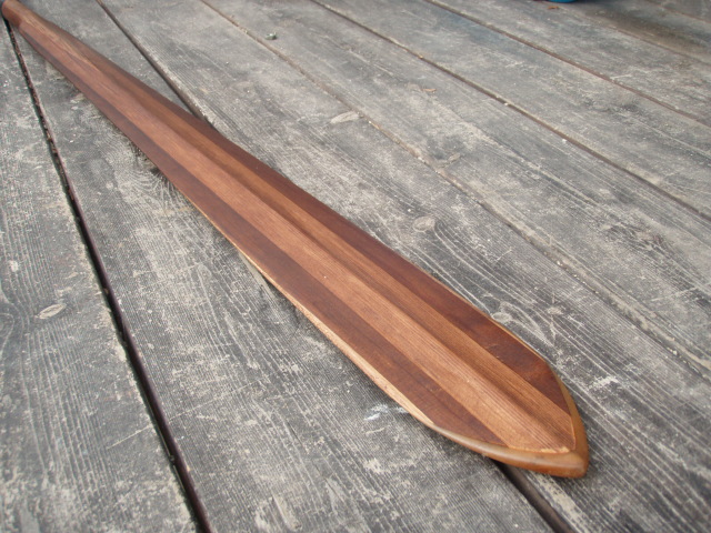 結果出来上がったのがグリーンランドとアリュートのミックスのような長いパドル。ブレードのパワーフェイス(漕ぐ面)にはアリュートパドルの特徴である凸状のシェイプが削りだされています。仕上げは柿渋です。