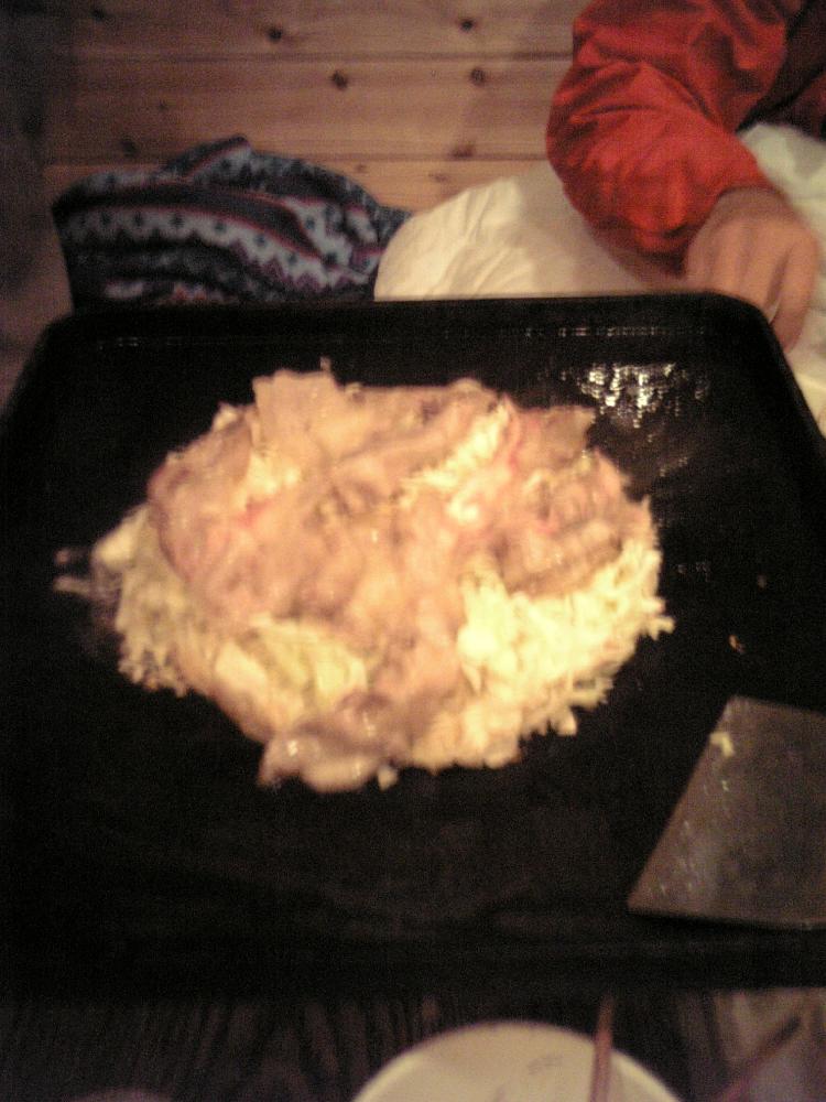 酔いちくれ(酔っ払い。博多弁)のイカ徳利課長が作ってくれた岡山風お好み焼き。自前の無意味なまでにゴツい鉄板で焼きます。なぜ岡山か?「大阪と広島の中間くらいだから!」だそうです。納得。