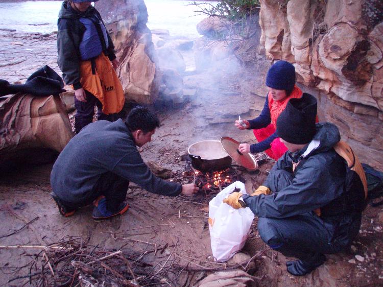 焚き火で調理します。ユニフレーム焚き火台の改造品がグリルです。常に潮を被る場所以外での焚き火は、次に来る人の為にも、なるべく跡を残したくないものです。