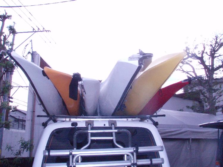 今日のサザンワークス1号。シングル4艇、タンデム2艇合計8名分をイッキ積み。一般の方でここまで積載する事は無いとは思いますが。バーはTHULEの「強化バー」という、一般のバーよりも肉厚なものを使用しています。業務用?の200cmのものをカットして175㎝で使用しています。このバーを使用することで走行中のカヤックの揺れが少なくなり(バーがしならない)、安心です。これは一般ユーザーの方にもオススメです。