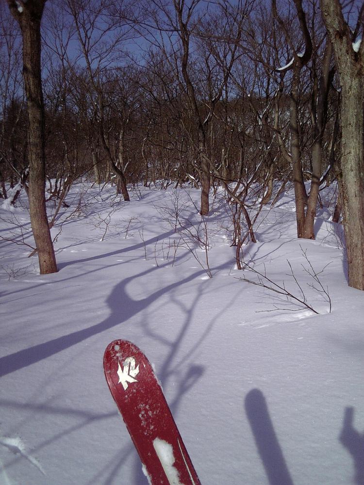 今回のフィールドであるT岳へ。地図を見ながら森の中を進みます。楽しいです。バイクで言うところのシングルトラックでしょうか。ただ、雪上では道は関係ないので、より自由に地形を楽しめます。やっとテレマークの楽しさが判ってきた!?