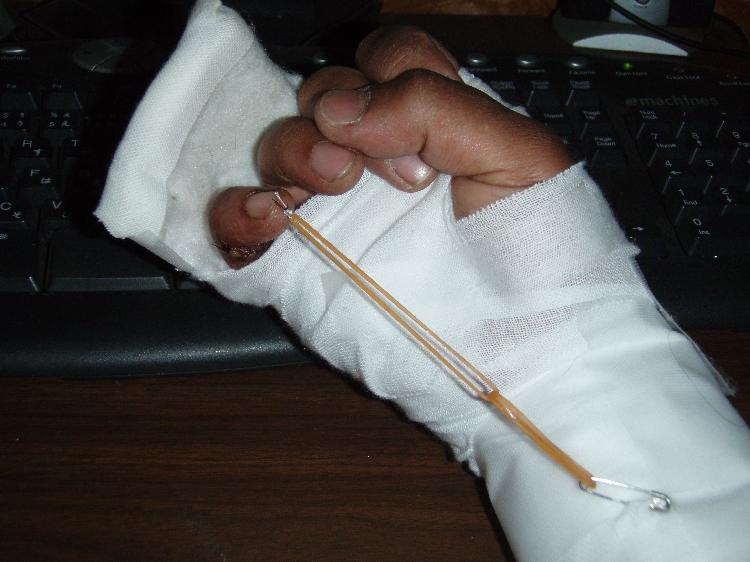 ギプスの付け替えに病院に行ったら、固定は緩くなった代わりに、こんなの(写真)になりました。爪に穴空けて輪ゴムが・・・。「指切りゲンマン養成ギプス」です。輪ゴムを「んふっ!んふっ!」と反発させて腱を鍛える訳ですね。