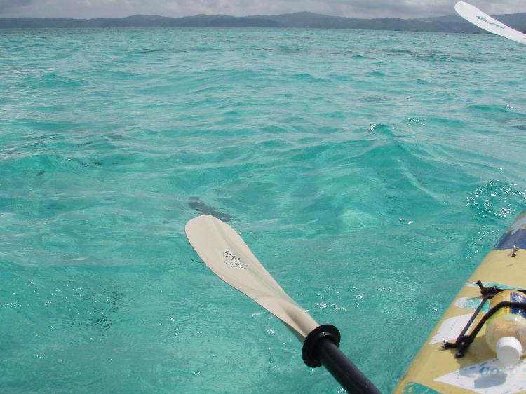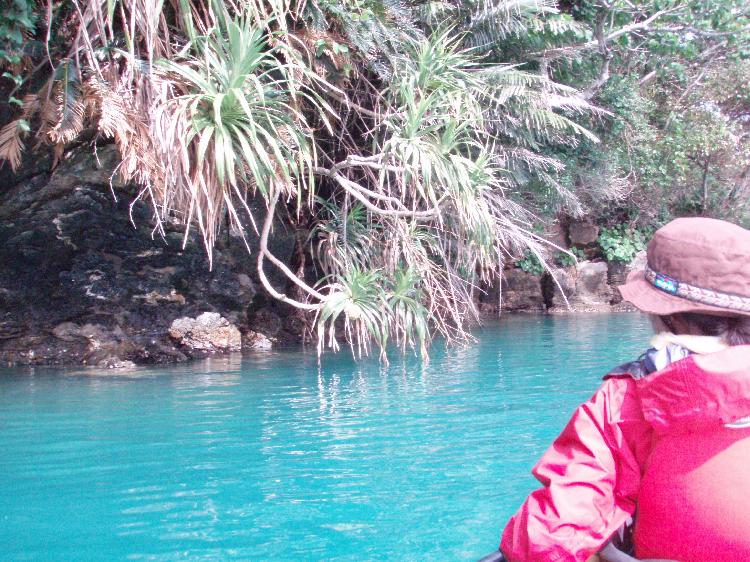 本部半島との間にある水道。沖縄でこんな内海を漕ぐのは初めてです。いかにも「ジャングル」的な植物と、深いターコイズブルーの海。