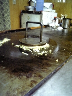 テンコ盛りのキャベツをムギューっとつぶすのに使うウェイト。30年以上使っている特注品だそうです。