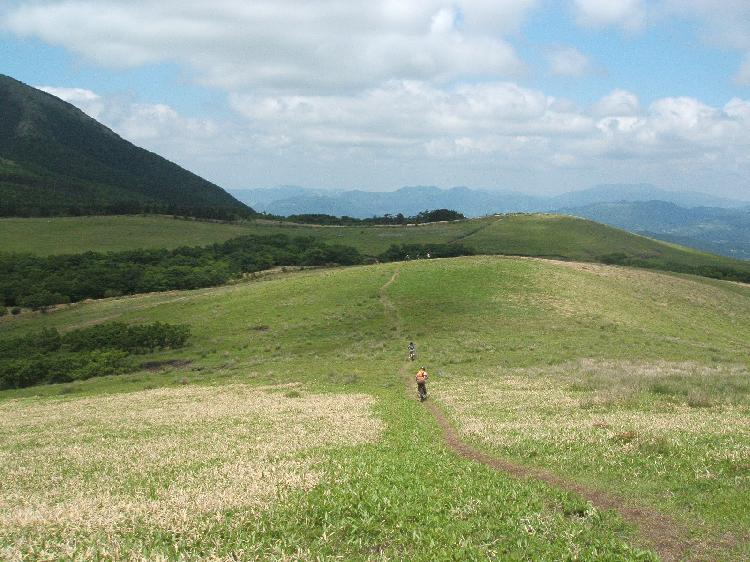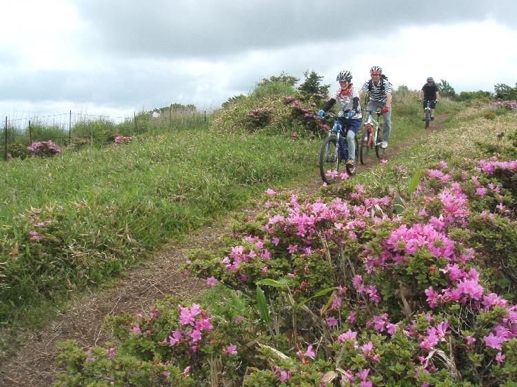 今回のMTBツアーはお日柄も良く、ミヤマキリシマがピンクの花をつけるトレイルを満喫できました。