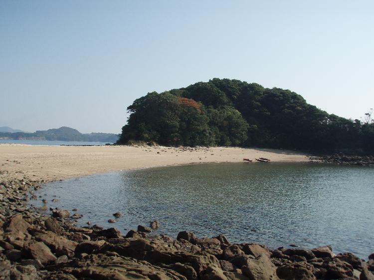 島に繋がる小さな砂州に上陸して休憩。次の岬を越えたら南九十九島だ。
