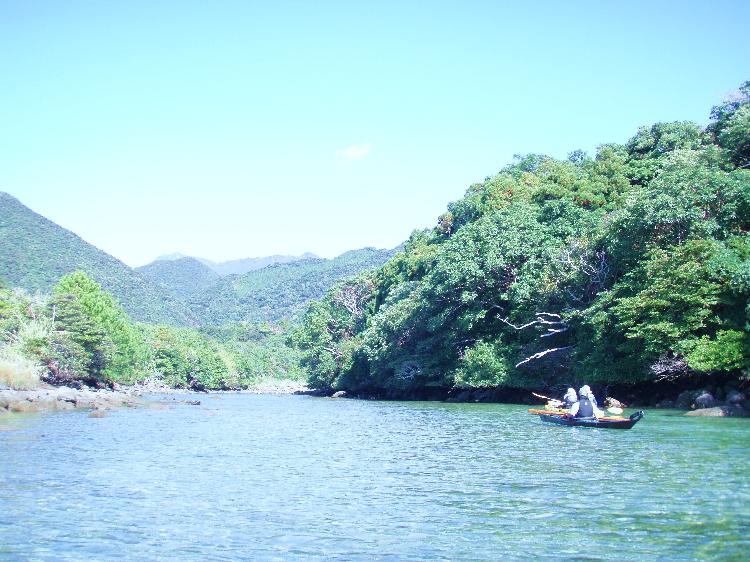 川を下って海へ。山々を眺めながらのパドリングは新鮮です。