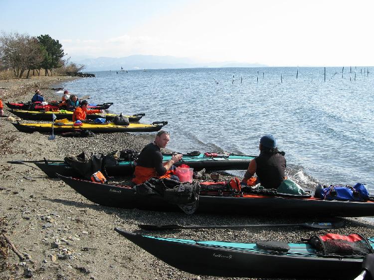 お昼の休憩。琵琶湖には浜が多く、休憩・キャンプに良さげなポイントがたくさんあります。潮汐も無いので、風波さえ無ければカヤックの真横にテントを張る事の可能なのが九州人の私には新鮮です。