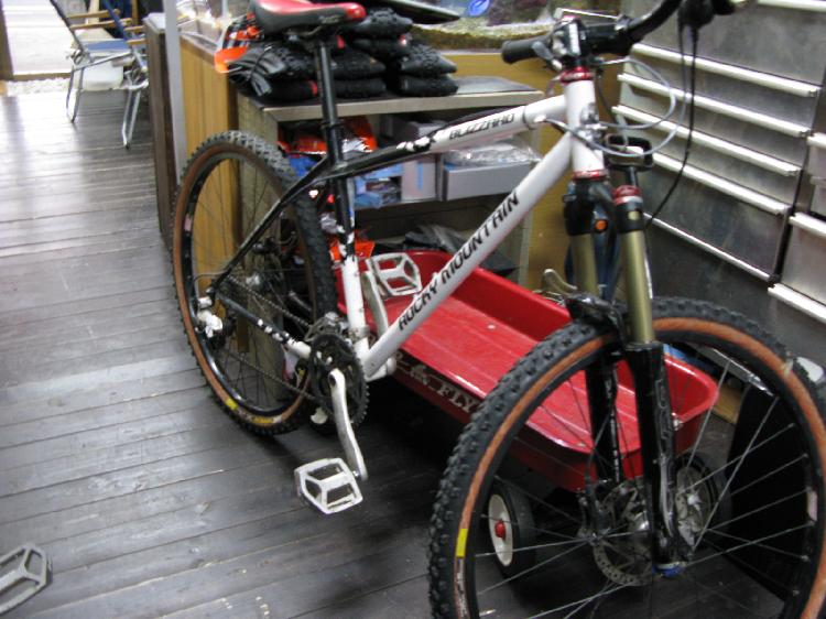 <写真>私の使用するもう1台。RockyMountain blizzard レイノルズ853スチールです。最近はフラットペダルもお気に入り。今となっては赤いサイドのタイヤはレトロ趣味か?