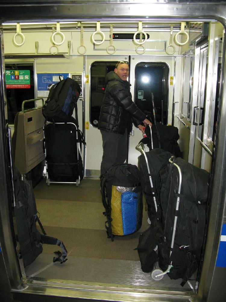 電車での移動はこんな感じです。JRで出艇地へ帰ります。フォールディングカヤックを使用したワンウェイのツーリングではクルマの回送やお迎えの手配などまったく関係なく、自分の力と都合でどうにでもなるのが自己完結しているというか、素敵です。