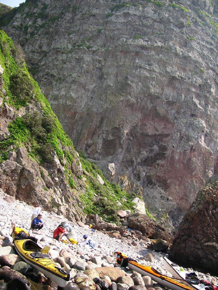 ゴロタの浜に上陸してお昼ごはん。後を振り返ると絶壁が迫ってきます。うひょ~。