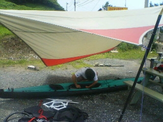 サーファーのMさんは波が無いためM君を冷やかしがてらロールの練習に。