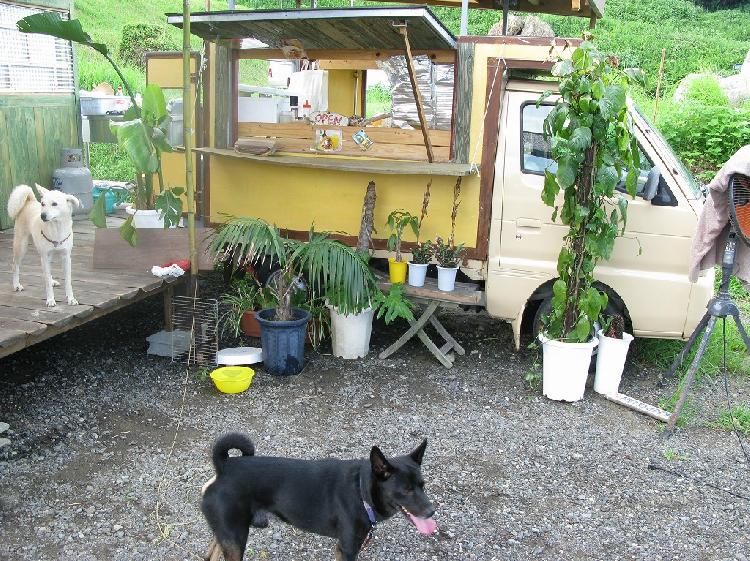 朝、「俺も海行く~」と言って無理矢理ついて来たロッキーはHINODEで留守番。左はHINODEのパクチー。黒白、どちらも雑種。