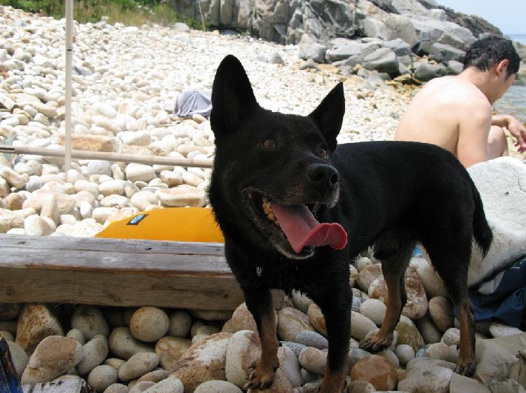 「今日は特別に」同行を許されたロッキー君。タープの下でへばってました。