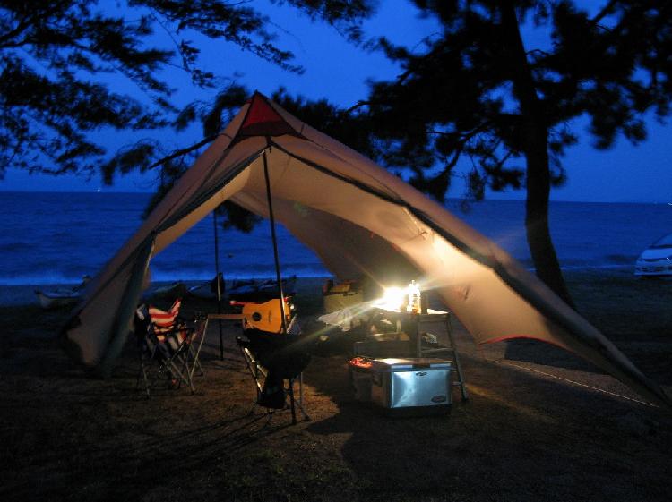 MSRの巨大三角テント(パビリオン)がしなります。シンプルですが悪状況に強いシェルターです。