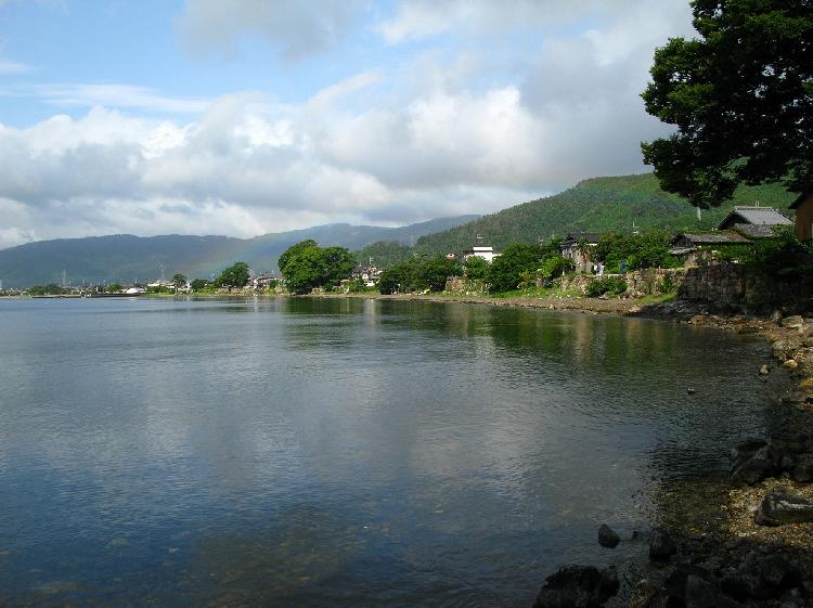 写真は海津の湖岸。夜のうち降った雨も上がり、爽やかな空気の中、虹が見えました。