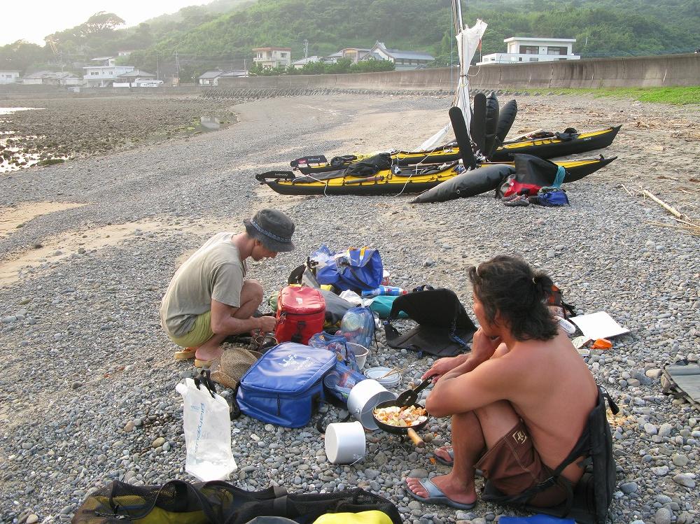 <写真上>南薩摩・久志の浜 ゴハンの準備をする大瀬志郎とニームラ君