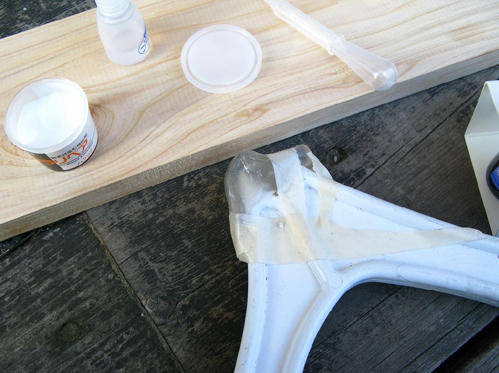 前から試してみたかった、「型取りくん」と「プラリペア」という製品を使いました。ゴム状の型取り剤で欠けてない同じ部分の型を取り、プラリペアは粉に硬化剤を混ぜてアクリル樹脂を形成します。パテなどの「接着」ではなく「溶着」なので期待ができますが。。。