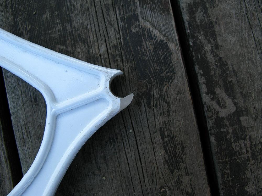 デモ艇として酷使してきた当店のカフナ・エクスペディション。クロスリブのエッジが欠けていました(下)。おそらくパッキングして宅配便で発送する際に破損したものと思われます。このままでも使用できるのですが、修理することに。