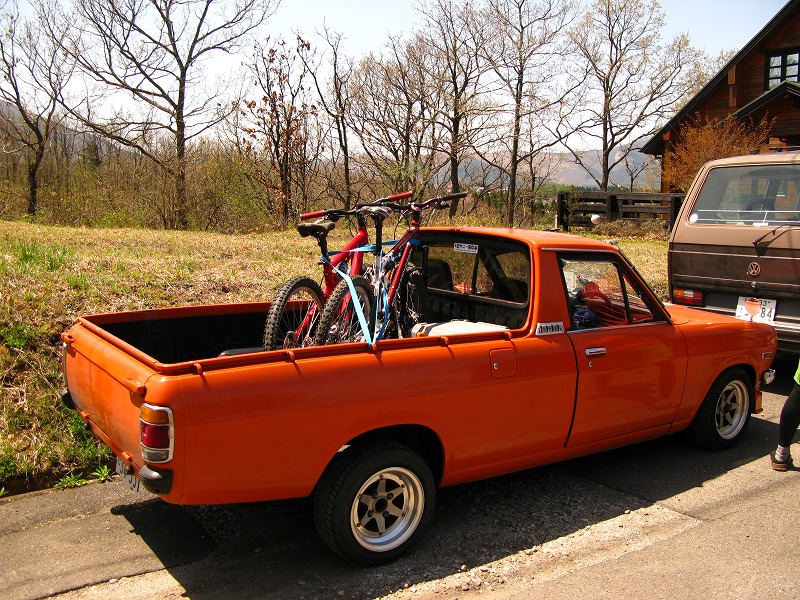 翌日、走りに行くチームは再び山へ。日本には日本のトラックが似合う。バイクは北米製ですが。